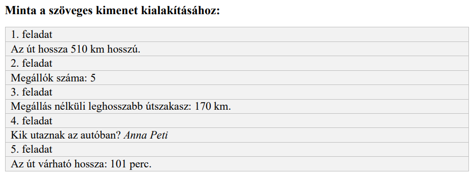 A képernyőre írást igénylő részfeladatok esetében az ékezetmentes kiírás is elfogadott. A mintához tartalmában hasonlóan – írja ki a képernyőre a feladat sorszámát (például: 2. feladat), valamint utaljon a kiírt tartalomra is!