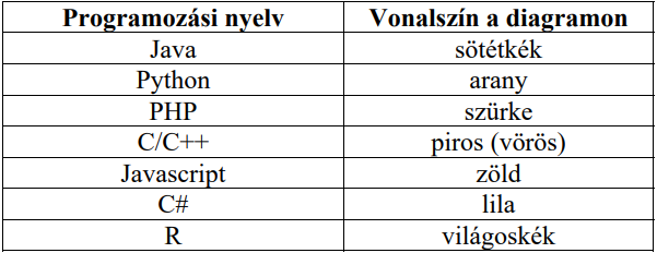 16. A diagram címe legyen a „Programozási nyelvek népszerűsége” szöveg! A programozási nyelvek nevét tartalmazó jelmagyarázat a vízszintes tengely alatt helyezkedjen el! A diagramon az adatsorozatok színét a következők szerint állítsa be: